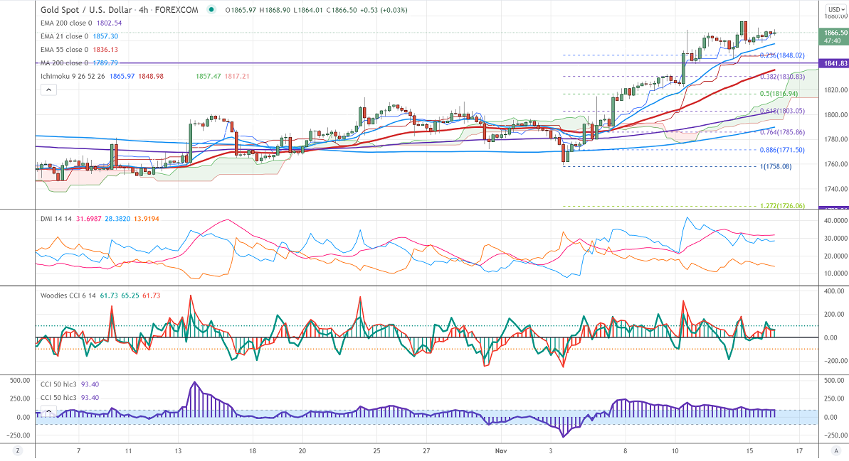 Gold is trading flat despite the strong US dollar. The US dollar index surged sharply and hits the highest level since July 2020. The improved market sentiment due to a virtual meeting between Biden and Xi ping also putting pressure on the yellow metal. Markets eye US retail sales for further direction. Gold hits a high of $1870 and is currently trading around $1865.72.