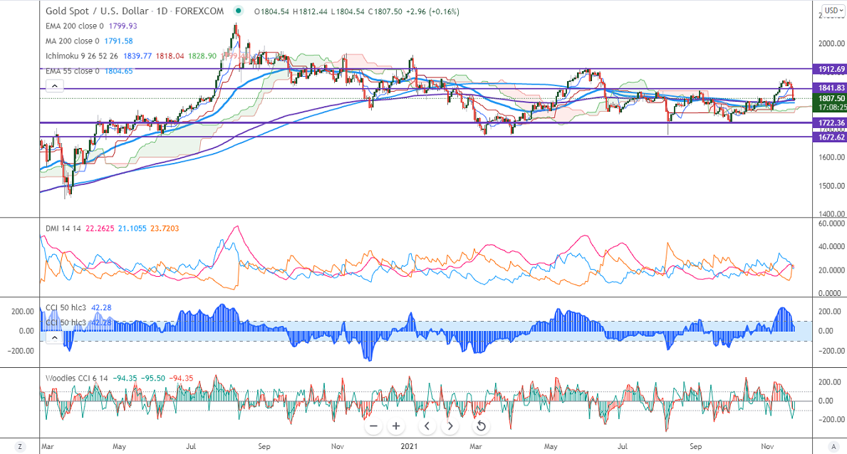 Gold has shown a massive sell-off after US President Biden nominates Fed Chairman Powell for the second term. The US dollar index surged sharply and hits the highest level since Jul 2020. The minor pullback in US treasury yield also puts pressure on the yellow metal. It hits a low of $1802 and is currently trading around $1807.90.