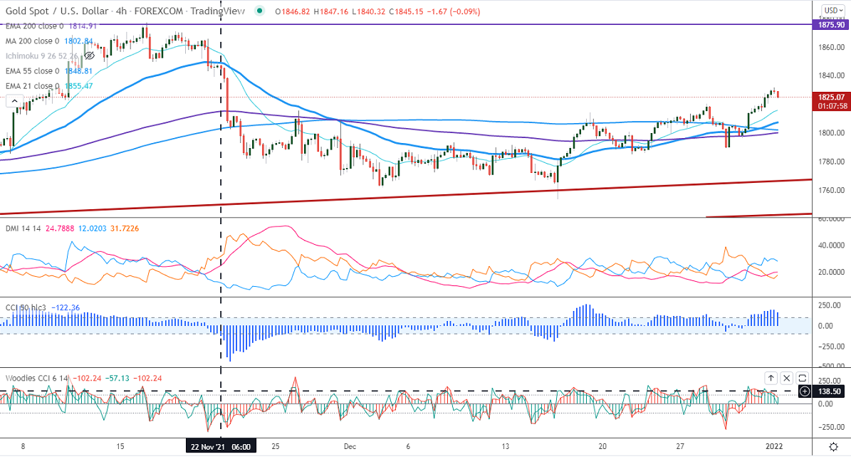 Gold hits six months high on weak US dollar and declining US treasury yields. The spread of omicron virus cases across the globe also supports the yellow metal. The other factor preventing gold from further upside is the tightening of monetary policy by major central banks. It hits a high of $1831.80 and is currently trading around $1825.69.