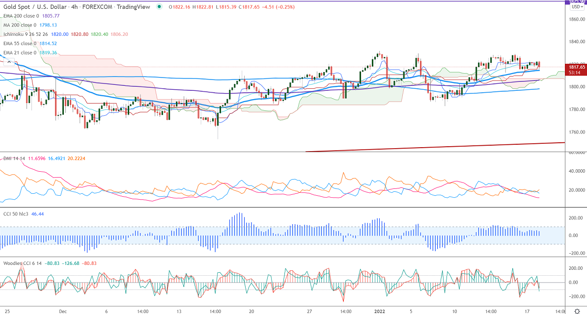 Gold halted its previous week's bullish trend on surging US Treasury yields. The US 10-year yield jumped sharply and hits the highest level since Jan 2020 on hawkish Fed comments. The hope of a rate hike by the Fed is putting pressure on yellow metal at higher levels. The minor pullback in the US dollar index after hitting a multi-week low of 94.62 also prevented gold from further upside. Gold hits an intraday low of $1815 and is currently trading around $1818.