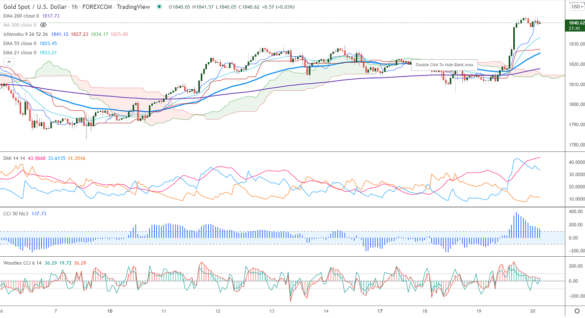 Gold renewed its bullish trend and surged more than $30 on safe-haven demand. The jump in UK inflation and geopolitical tension between Russia and Ukraine also support the yellow metal. The stock market extends its losses for the second consecutive day due to a rise in US treasury yields. The US 10-year yield cooled off slightly after hitting a two-year high. Gold hits a low of $1844 and is currently trading around $1841.13.