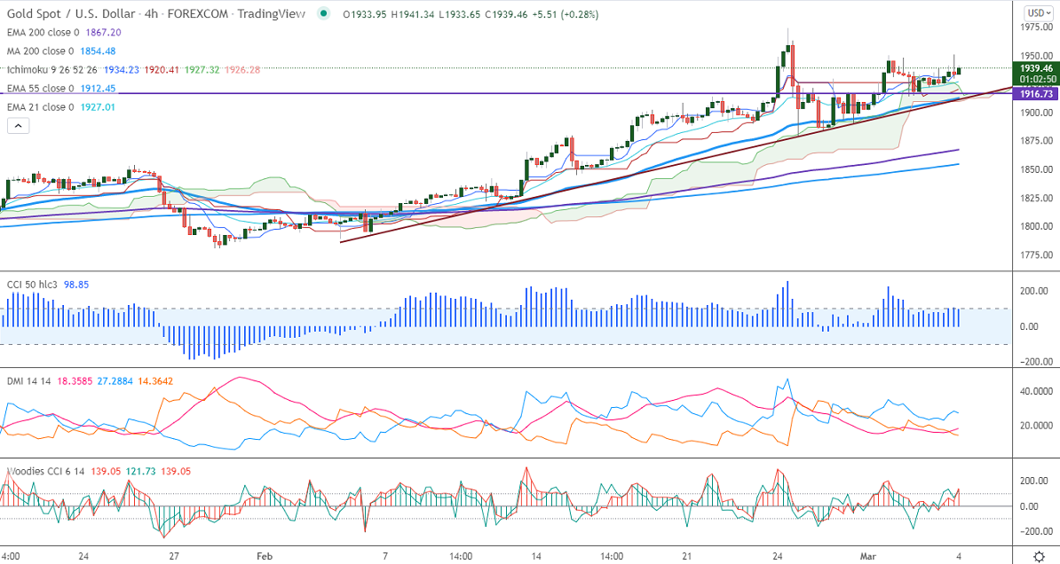 Gold holds above the $1900 level despite the strong US dollar. Fears over Russia's attack on Europe's largest nuclear power plant in Ukraine have increased demand for safe-haven assets. Markets eye Russia and Ukraine peace talks. Gold hits a high of $1948 yesterday and is currently trading around $1922.26.