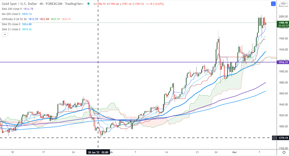 Gold halted its four weeks of a bullish trend on improved market sentiment. The yellow metal showed a massive rally this month and jumped more than $100 on geopolitical tension between Russia and Ukraine. The surge in oil price will increase inflation further supporting precious metals. Gold hits an intraday low of $1981 and is currently trading around $1988.70.