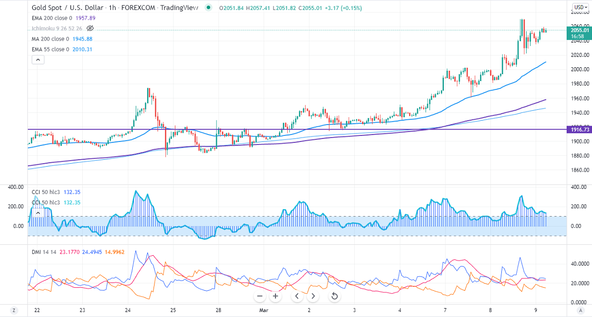 Gold hits a record high at $2070 on geopolitical tension. The war between Russia and Ukraine has increased the demand for safe-haven assets like Gold. The yellow metal gave of some of its gains due to profit booking and a minor pullback in the equity market. The surge in oil price on account of sanctions on Russia by the US and UK supports precious metals. Gold hits an intraday high of $2059 and is currently trading around $2054.50.