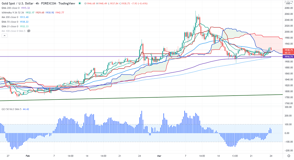 Gold regained after hitting a low of $1915.55 as crude continues to surge. Russia and Ukraine conflict has increased demand for safe-haven assets like gold and Swiss franc. The US 10-year yield hits a multi-year high on hawkish fed chairman comments. The yellow metal hits an intraday high of $1948.47 and is currently trading around $1938.37.