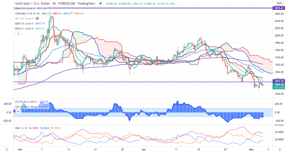 Gold gained slightly after a decline of $40 this week. Markets eye US Fed monetary policy for further direction. According to the Fed watch tool, the probability for a 50 bpbs rate hike in June has increased to 99.1% from 80.4% a week ago. Markets eye Fed comments about Quantitative tightening plan for further direction. The yellow metal hits an intraday high of $1869 and is currently trading around $1863.68.
