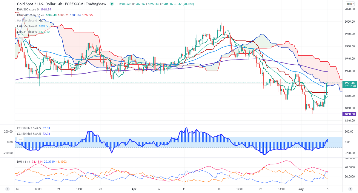 Gold gained sharply after Fed's monetary policy. The central bank has hiked rates by 50 bpbs as expected and plans to trim its $9 trillion balance sheet. "The Committee is highly attentive to inflation risks," the FOMC said in its updated policy statement. The yellow metal gained after Fed Chairman ruled out a 75 bpbs rate hike in the next meeting. It hits an intraday high of $1903 and is currently trading around $1901.85.