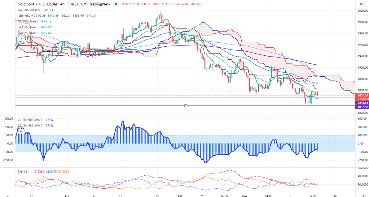 Gold regained above $1850 after US CPI data. It cools off to 8.3% from March's 40-year high of 8.5%. The inflation is better than the forecast of 8.1%. The surge in the US dollar index and crude oil prices puts pressure on the yellow metal at higher levels. Markets eye US PPI data today for further direction. It hits an intraday high of $1858.85 and is currently trading around $1851.14.
