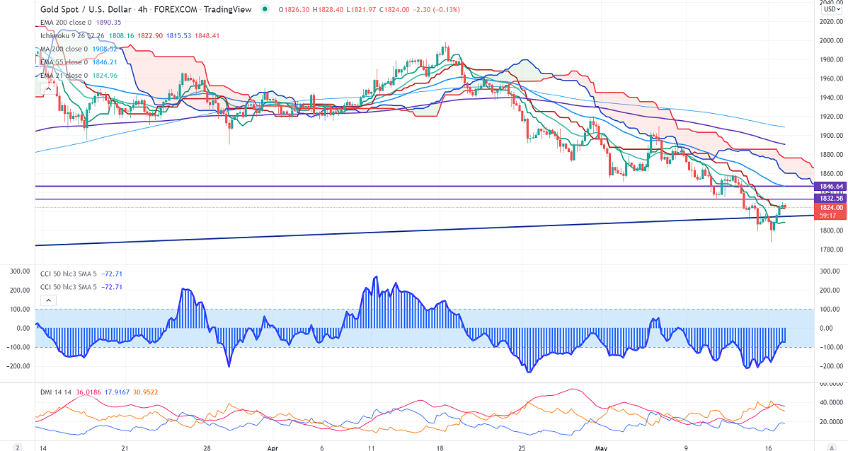 Gold regained above $1800 on the sell-off in the US dollar. The weak Empire state index showed a minor impact on the US dollar. It slumps to -11.6 in May compared to a forecast of 15.3. It hits a high of $1829.35 and is currently trading around $1823.50.