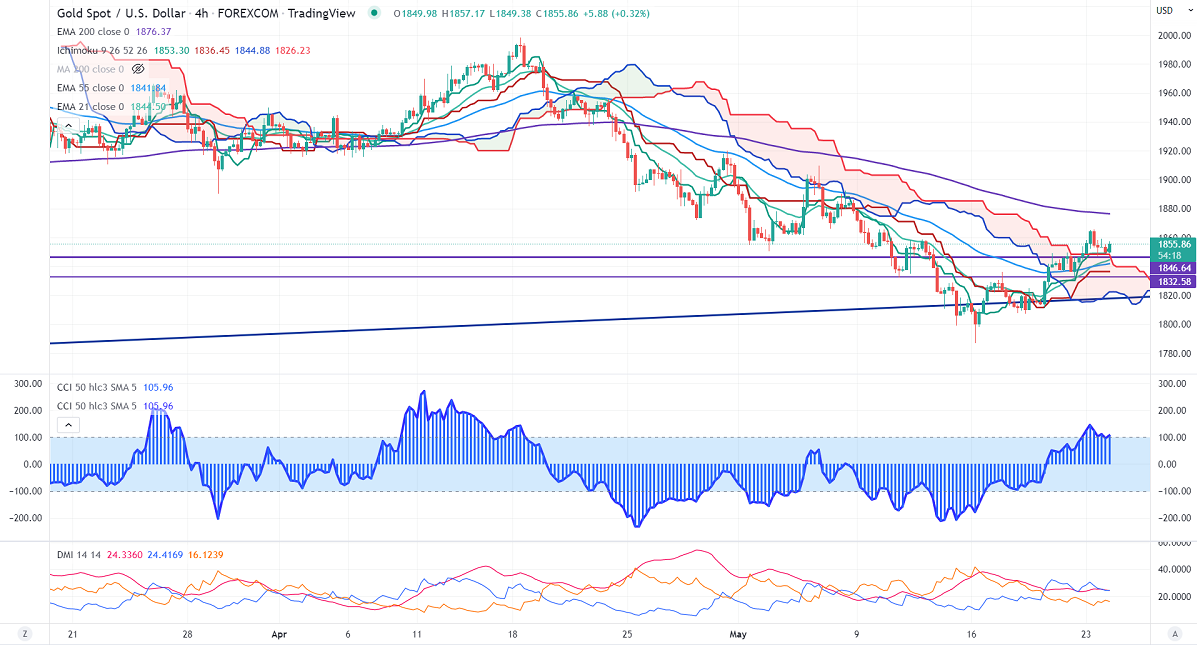 Gold holds above $1850 on extreme weakness in the US dollar. It has lost more than 2.5% after hitting a 19-year high at 105. The surge in equities came after Biden said he is weighing reducing tariffs on China puts pressure on the yellow metal at higher levels. It hits a high of $1857.15 and is currently trading around $1856.30.According to the CME Fed watch tool, the probability of a 50 bpbs rate hike dropped to 88.8% from 94.9% a day ago.