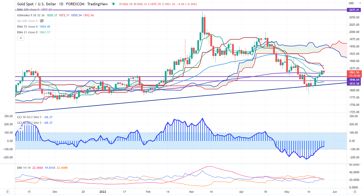 Gold trades higher for the third consecutive day on a weak US dollar. Markets await US Fed meeting minutes for further direction. US flash manufacturing PMI dropped to 57.5 in May compared to an estimate of 57.50. It hits a high of $1869.50 and is currently trading around $1862.50.According to the CME Fed watch tool, the probability of a 50 bpbs rate hike dropped to 89.80% from 92.30% a day ago.