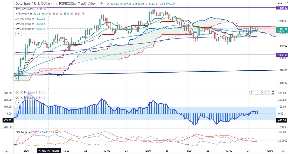 Gold holds above $1850 after a minor dip to $1840 on the weak US dollar. It hits fresh monthly lows on dismal economic data would dampen rate hike expectations. According to the CME Fed watch tool, the probability of a 50 bpbs rate hike in Jul jumped to 89.4% from 86.2% a week ago.