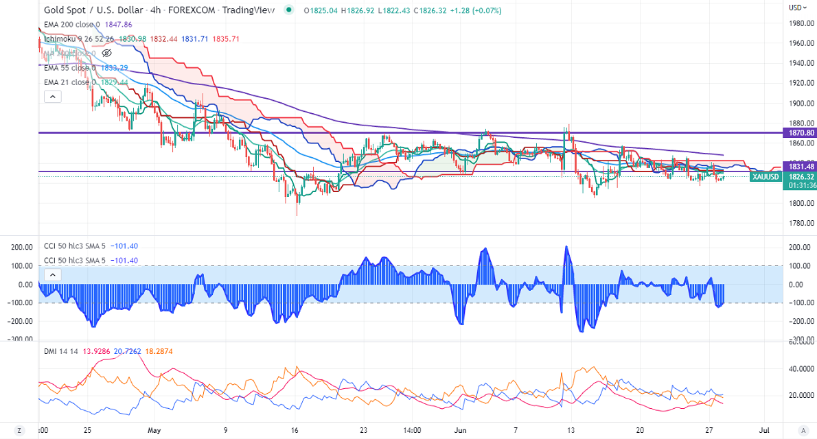 Gold price lost its shine as risk appetite picked up. The global stock market rally and a minor pullback in US treasury yield also put pressure on the yellow metal.G7 countries planning to impose sanctions on Russia is positive news for the precious metal. According to the CME Fed watch tool, the probability of a 75 bpbs rate hike in Jul rose to 92.7% from 88.7% a week ago. It hits a low of $1816 the previous week and is currently trading around $1835.50.