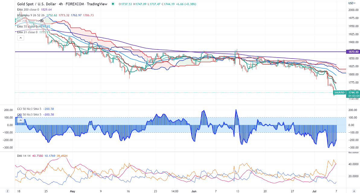 Gold price continues to trade lower on the strong US dollar. The yellow metal breaks strong support at $1750 and holds below that level. US dollar index pared some of its gains after hitting a 20-year high. US ISM services PMI dropped to 55.3 in June compared to 55.9 the previous month and came in better than expected at 54.5. Markets eye US ADP employment and jobless claims data for further direction. According to the CME Fed watch tool, the probability of a 75 bpbs rate hike in Jul rose to 93.9% from 87.3% a week ago. It hits a low of $1732 yesterday and is currently trading around $1744.37.