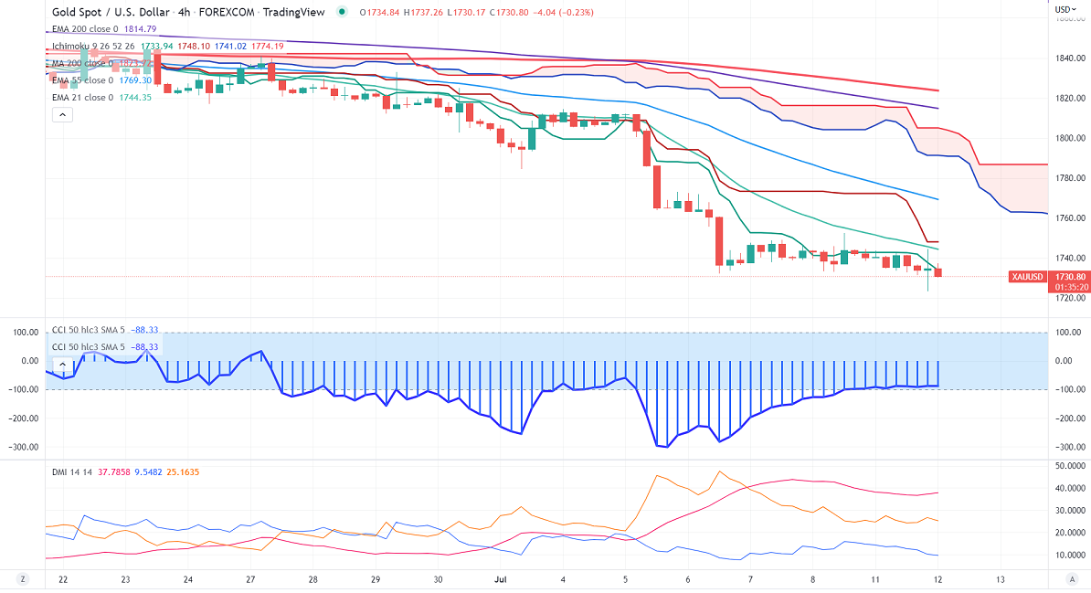 Gold price trading was highly volatile yesterday and showed a wild spike of more than $20 from a low of $1723.29. The bullish US dollar index in hopes of aggressive rate hikes puts pressure on the yellow metal at higher levels. US dollar index continues to gain and hits the highest level since Oct 2002 on recession worries and inflation concerns. According to the CME Fed watch tool, the probability of a 75 bpbs rate hike in Jul rose to 90.6% from 86.2% a week ago.