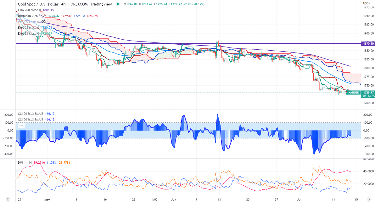 Gold price lost more than $25 after US CPI data. US CPI hits a 40-year high at 9.1% on a yearly basis in June compared to market expectations of 8.8%. US dollar index gained strength on recession woes. It holds well above the 108 level, any breach above 108.56 confirms further bullish continuation. According to the CME Fed watch tool, the probability of a 100 bpbs rate hike in Jul rose to 82.1% from 7.6% a week ago.