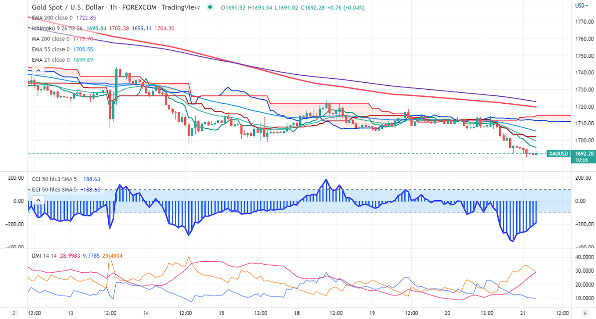 Gold price broke psychological support at $1700 and settled below that level. Market eyes European Central bank policy for further direction. A hawkish rate hike by ECB will drag the yellow metal further down. US dollar index pared most of its gains made yesterday on profit booking. According to the CME Fed watch tool, the probability of a 100 bpbs rate hike in Jul dropped to 33.2% from 36.2% a day ago.