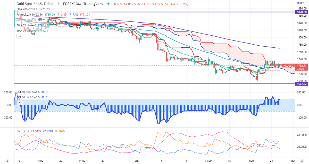 Gold price traded in a narrow range between $1739.25 and $1715 for the past three days. Markets eye the US fed monetary for further direction. The decline US 10-year yield by more than 6.5% the previous week supported the yellow metal at lower levels. US dollar index pared most of its gains after hitting a multi-year high of 109.29. According to the CME Fed watch tool, the probability of a 75 bpbs rate hike in Jul dropped to 75.1% from 80.5% a day ago.