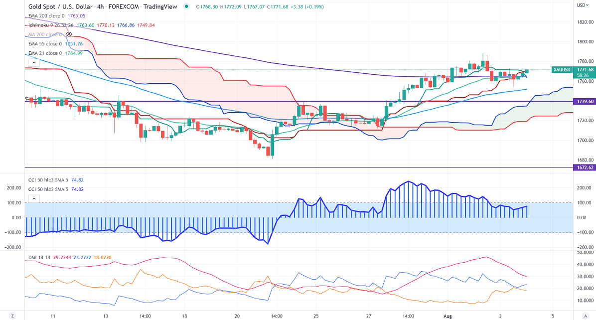The gold price rebounded after hitting a low of $1755 yesterday. The demand for safe-haven assets after US House Speaker Nancy Pelosi visits Taiwan. The minor downtick in US 10-year bond yield supports the yellow metal at lower levels. Market eyes BOE monetary policy today for further direction. According to the CME Fed watch tool, the probability of a 75 bpbs rate hike in Sep rose to 40.50% from 29% a day ago.