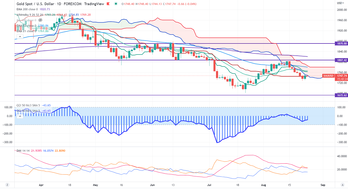 Gold price correcting from minor top $1802.57 on strong US dollar. It has pared some of its gains ahead of US durable goods orders and the Fed chairman's speech at Jackson hole. Any close above 109.30 confirms further bullishness.