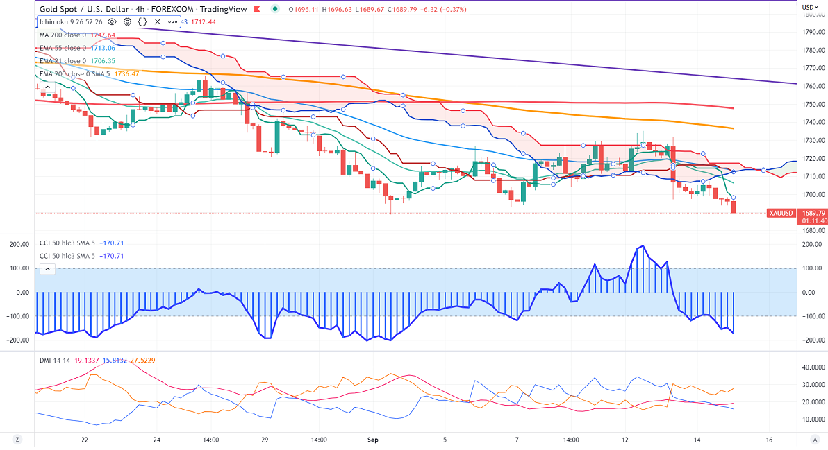 Gold continues to trade lower on surging US treasury yields. US PPI for August declined by -0.1% in line with expectations. The core producer price index jumped 0.40% vs the estimate of 0.30%. Markets eye US retail sales and empire state manufacturing index for further direction. The overall trend is still bullish as long as support of $1680 holds.