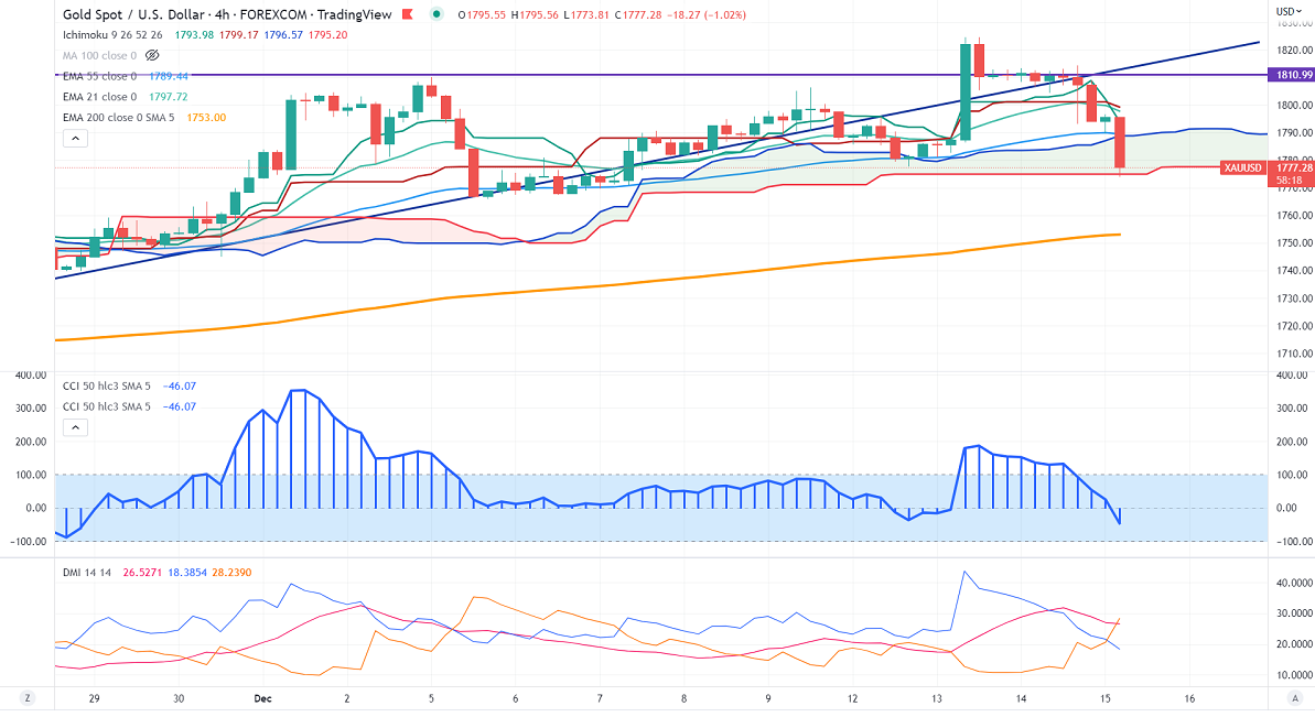 Gold lost more than $50 after the hawkish Fed rate hike. The central bank hiked 50 bpbs at 4.25% -4.5%, the fourth consecutive increase. The dot plot shows the median rate at end of 2023 at 5.1% vs 4.6% at the September meeting. The US dollar index gained more than 100 pips after the monetary policy. The yellow metal hits a low of $1773.50 and is currently trading around $1775.80.