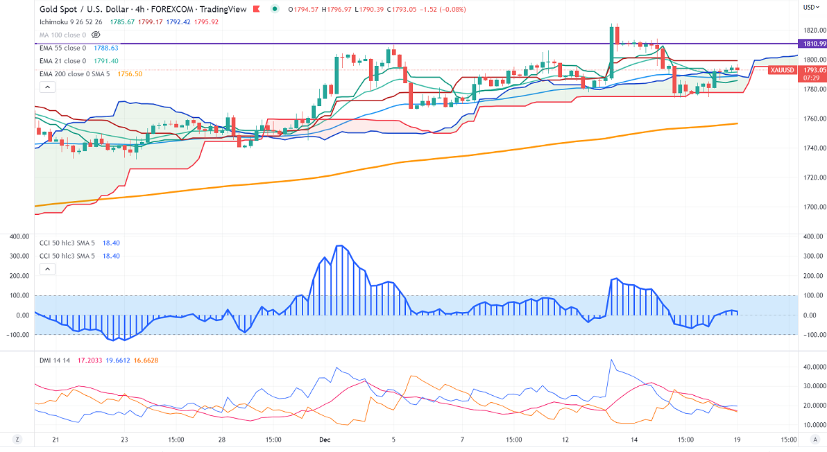 Gold showed a minor pullback despite a rate hike by central banks.US fed, ECB, SNB, and Bank of England hiked rates by 50 bpbs. The yellow metal hits a high of $1824.50 and is currently trading around $1791.