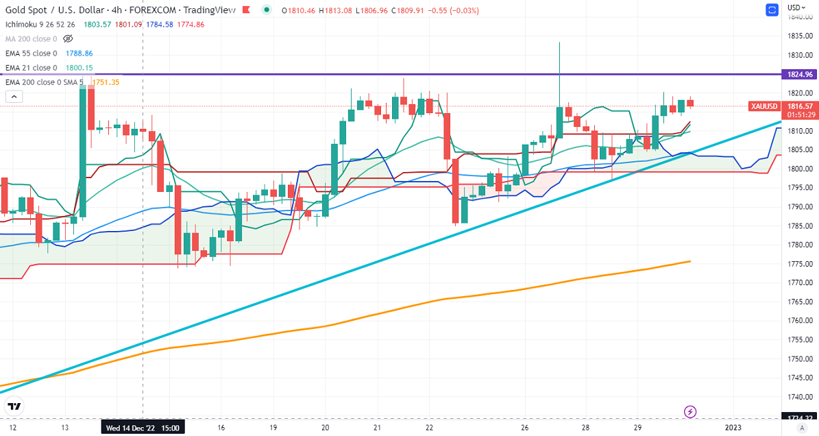 The near–term support is around $1800, a break below targets of $1780/$1760/$1740/$1720/$1700. The yellow metal faces minor resistance around $1825, breach above will take it to the next level of $1840/$1860/$1900.