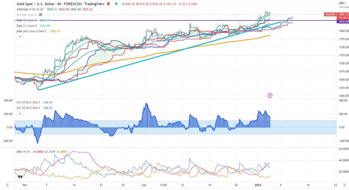 Gold pared some of its gains after Fed meeting minutes. The minutes from Dec 13-14 showed that participants agreed that inflation was high and central bank should continue increasing rates at a slower pace to tackle inflation. No participants are willing to lower interest rates in 2023. It hits a high of $1850 and is currently trading around $1846.55.