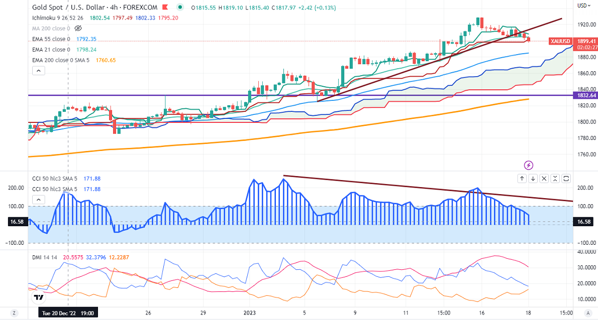 Gold pared most of its gains on the weak yen. The US dollar gained momentum against Yen Post BOJ monetary policy. The central bank has kept its yield curve control policy unchanged. USDJPY gained more than 2% after the dovish policy by the Bank of Japan. Gold hits a low of $1897 and is currently trading around $1898.94.