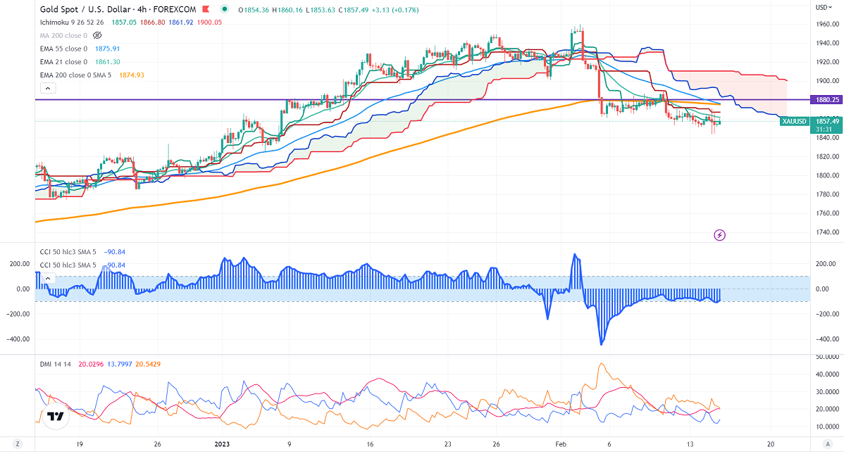 Gold showed a minor pullback despite hot US inflation CPI for Jan came at 6.4% YOY, above the estimate of 6.2%. It has declined for the seventh consecutive month after peaking at 9.1% in Jun 2022. It hits a low of $1843.50 and is currently trading around $1857.40.