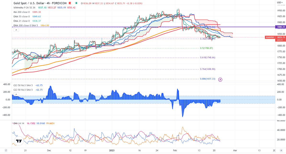 Gold prices trade flat ahead of FOMC meeting minutes. Any hawkish comments from Fed chairman Powell will drag the yellow metal further lower. It hits a low of $1831.19 and is currently trading around $1836.77.