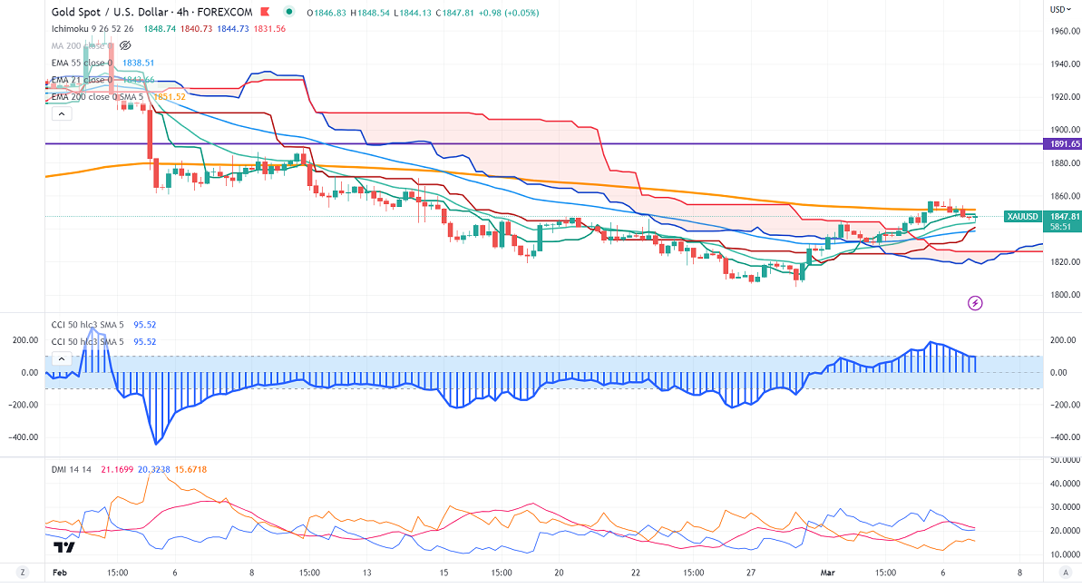 The near–term support is around $1837, a break below targets of $1820/$1800/ $1788/$1748. The yellow metal faces minor resistance around $1851, and a breach above will take it to the next level of $1860/$1888/$1900.