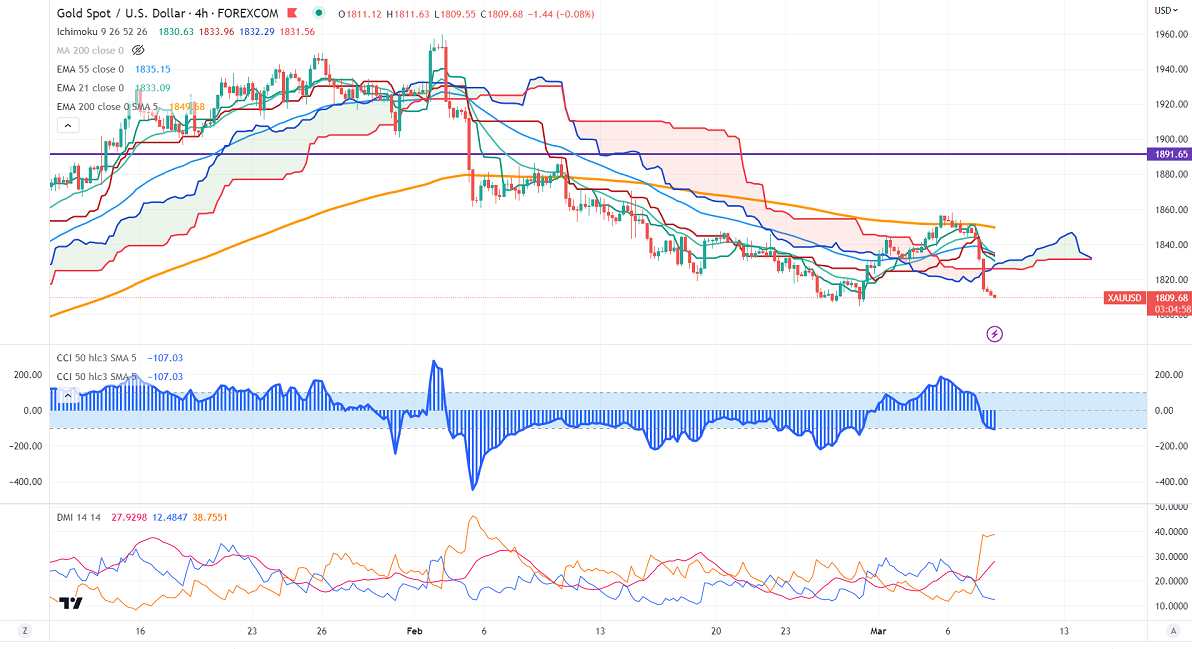 Gold prices lost their shine after the hawkish Fed chairman speech. It shows that Fed is likely to increase rates more than anticipated. Fed chairman said that the central bank is also "prepared to increase the pace of rate hike. Gold hits a low of $1810.68 and is currently trading around $1810.44.