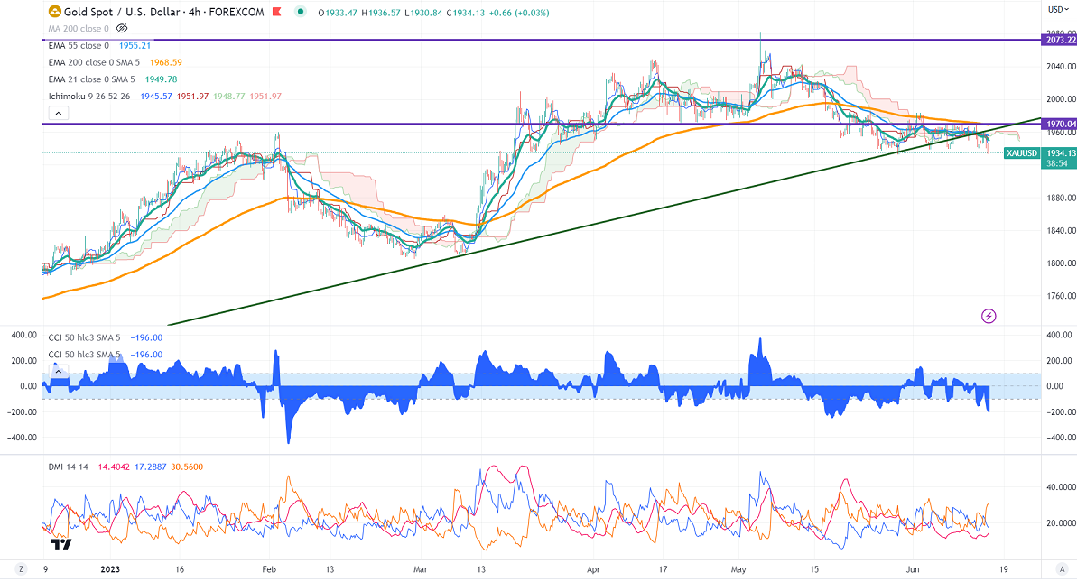 Gold prices lost their shine after US Fed monetary policy. Fed kept its rates unchanged at 5-5.25%. The central bank has projected the median federal funds rate from 5.1% to 5.6% (three more 25 bpbs rate hikes in 2023). For 2024 it increased from 4.3% to 4.6%. It hits a low of $1940 and is currently trading around $1949.04.