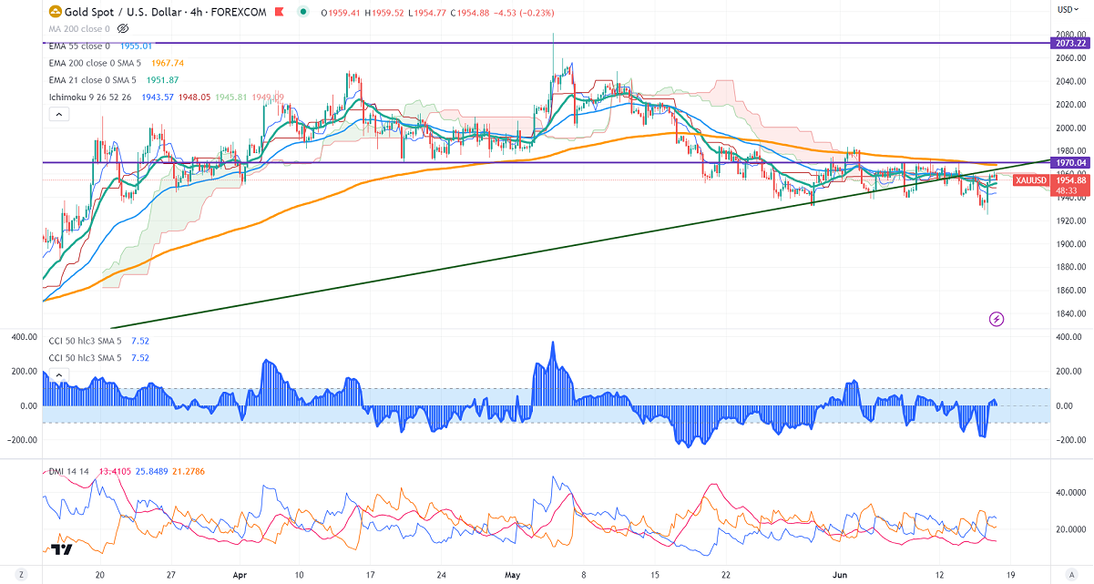 Gold prices recovered more than $20 on the weak US dollar. Euro gained momentum yesterday after the ECB hiked rates by 25 bpbs to 3.50%, the highest since 2001. It hits a high of $1962 and is currently trading around $1955.75.