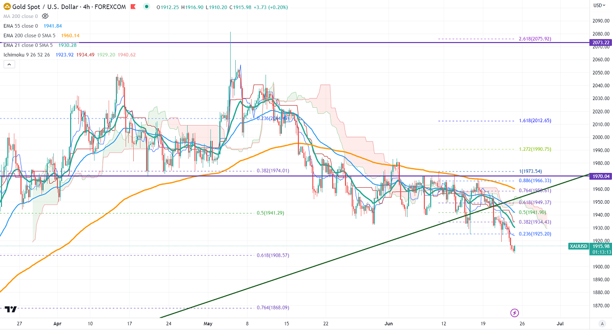Gold prices showed a massive sell-off after Powell's testimony and rate hike by major central banks. US Fed chairman Powell reaffirmed that two more hikes have dragged gold further down this year. The hawkish testimony by Powell has pushed the dollar higher. It hits a low of $1910.40 and is currently trading around $1912.67.