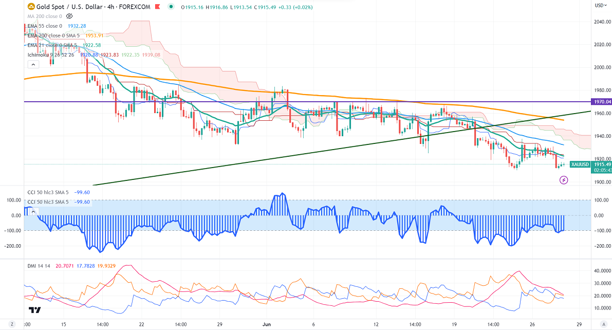 Gold prices pared some of their gains on upbeat US economic data. US durable goods orders surged 1.7% m/m, above the forecast of -1%. US Conference Board consumer confidence rose to 109.70 in June from 102.50 in May. Sales of new US single-family homes increased to 763000 in May, the highest level in 1-1/2 years. It hits a low of $1911 and currently trading around $1915.58.