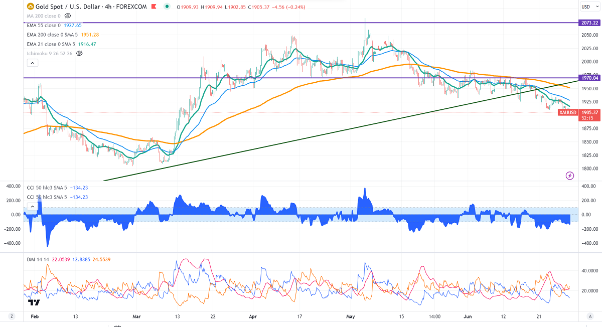 Gold prices traded weak for the second month and lost more than $170. ECB president Lagarde and Fed Chairman Powell hinted that the central bank will continue to hike rates to tackle inflation. The US dollar index gained momentum after upbeat US economic data. years. It hits an intraday low of $1902.85 and currently trading around $1905.