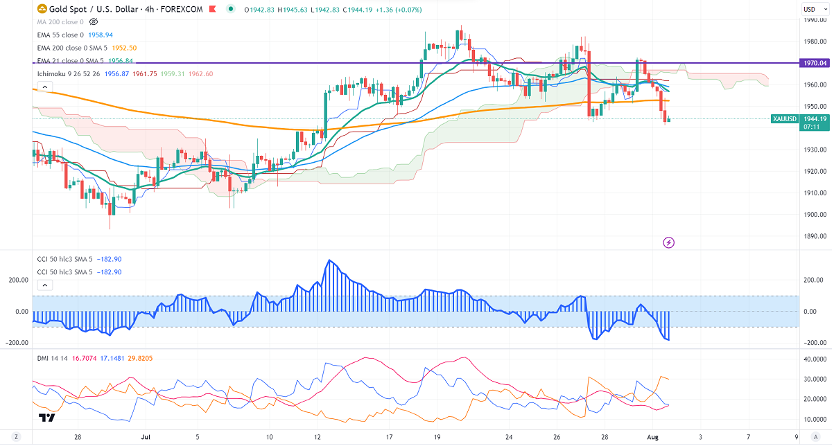 Gold showed a massive sell-off on the strong US dollar and surging US bond yields. It hits a low of $1941.30 and is currently trading around $1944.49.