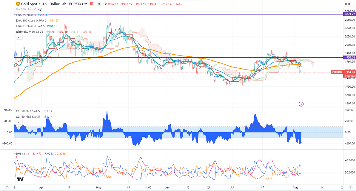 Gold traded weak for the second consecutive day on a strong US dollar It has gained momentum despite Fitch downgrading US. It has lowered the credit rating of the United States from AAA+ to AA+. It hits a low of $1933.30 and is currently trading around $1937.69.