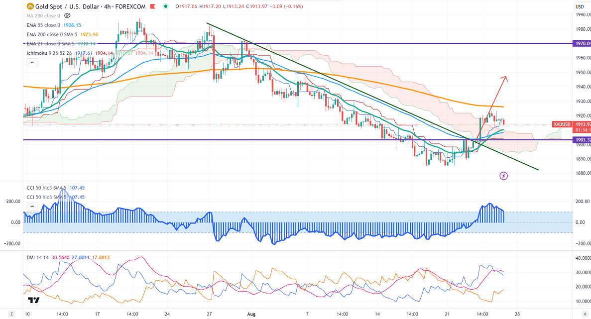 Gold pared some of its gains ahead of Powell's speech at the Jackson Hole symposium. It hit a low of $1913.24 at the time of writing and is currently trading around $1913.58.