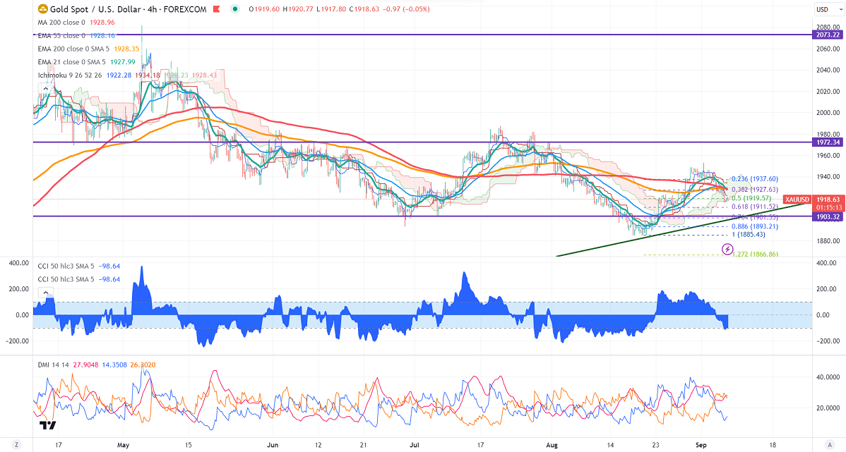 Gold holds below $1920 on upbeat US ISM services PMI data. It has a low of $1915.37 at the time of writing and is currently trading around $1919.88.