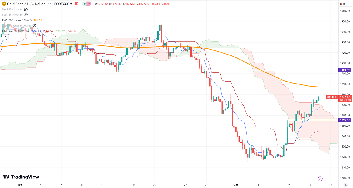Gold trades higher after dovish FOMC minutes. It hit a high of $1878 and is currently trading at around $1877.05.