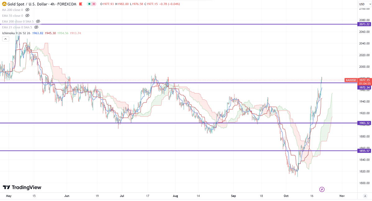 Federal Reserve Chairman said on Thursday that soaring US bond yield signals the end of rate hikes. He also said that inflation remains too high and central bank will take necessary actions to tackle inflation. The number of people who have filed for unemployment benefits declined by 13000 to 198000 for the period ended Oct 14th, below the estimate of 210000.