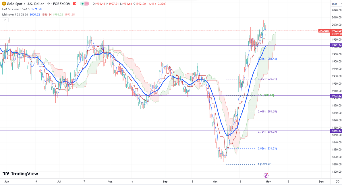 Gold pared some of its gains on improved risk appetite. It hit a high of $2009.42 yesterday and is currently trading at around $1991.80.