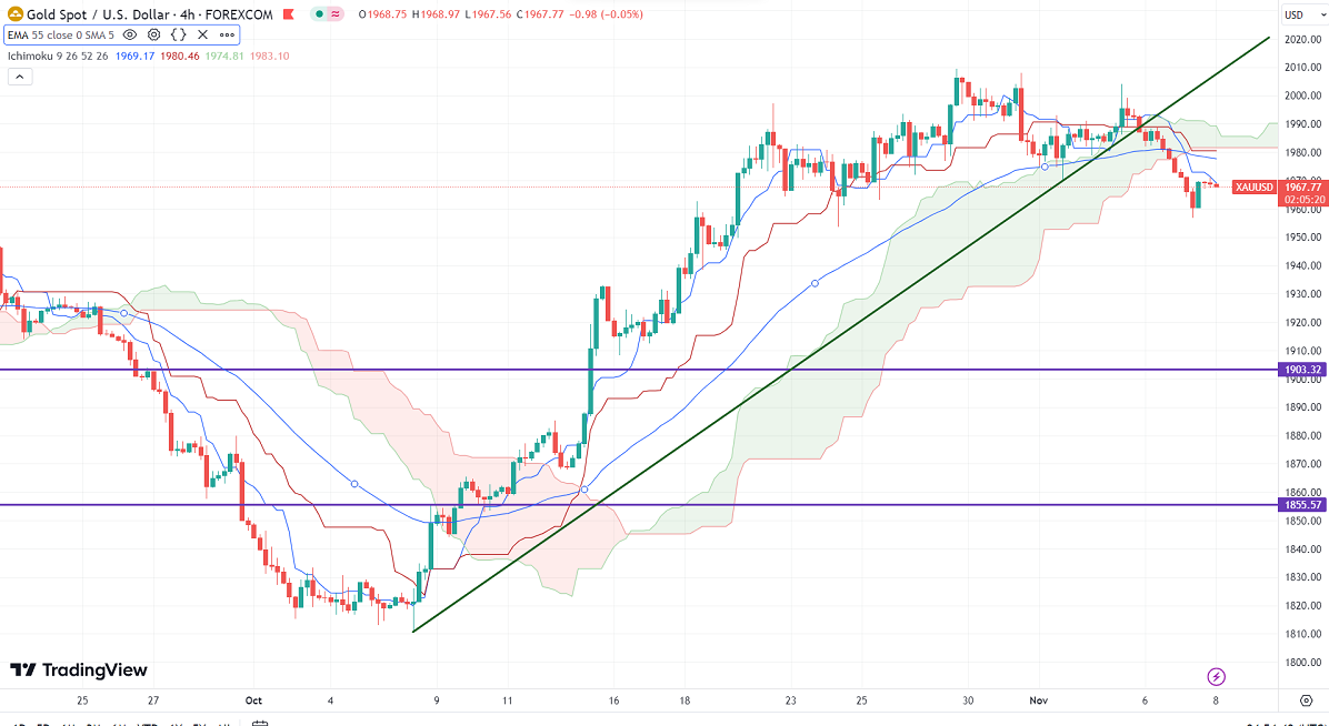 Gold trades weak for the second consecutive day on board-based US dollar buying. It hit a low of $1956.78 and is currently trading around $1967.74.