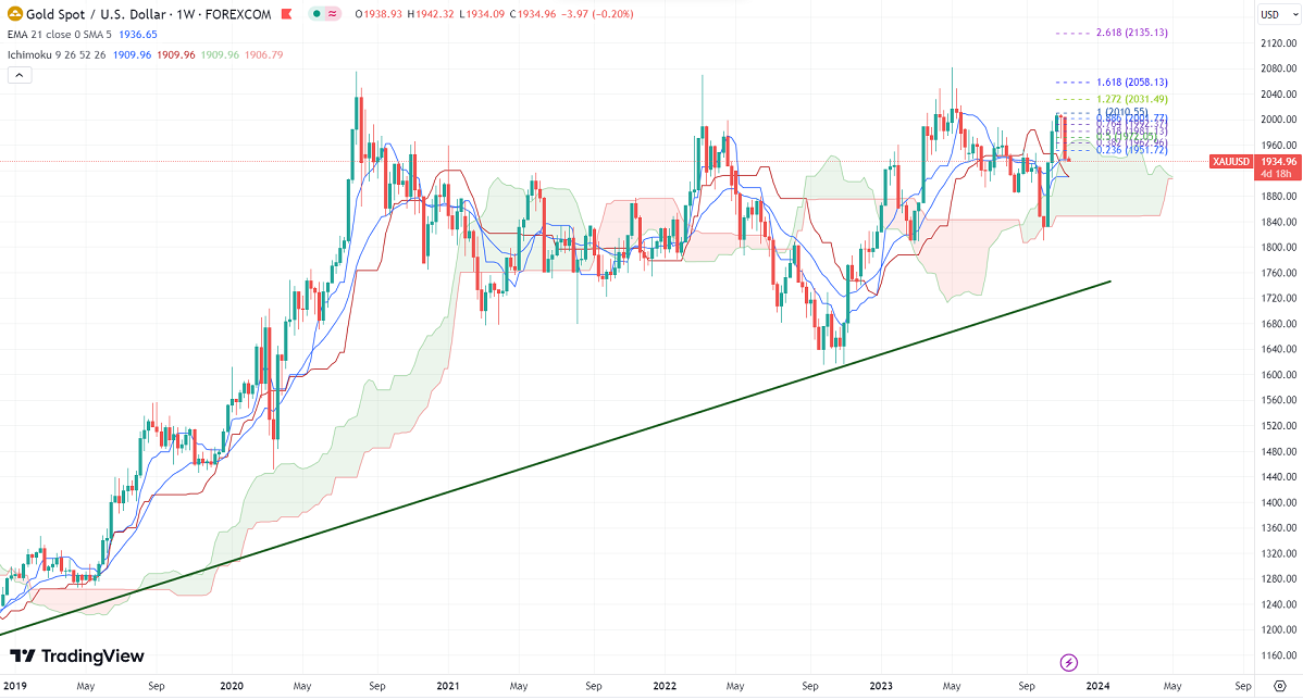 Gold was one of the worst performers the previous week. It hit a low of $1933 and is currently trading around $1935.The yellow metal lost its shine after hawkish comments from Powell at the IMF event.
