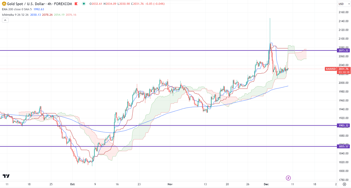 Gold showed a minor pullback ahead of US NFP data. It hit a high of $2039.99 and is currently trading around $2031.80.