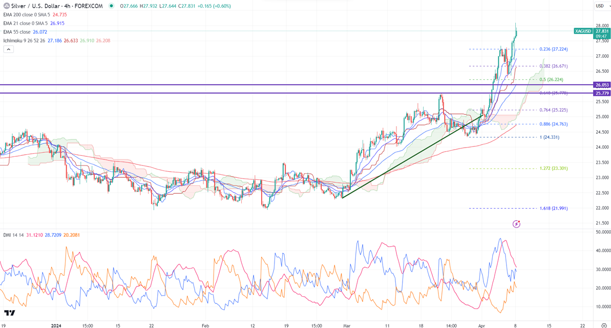 It trades above 21, 55- EMA, and above 200 EMA in the 4-hour chart. The near-term support is around $27.20 and a break below the targets of $26.85/$26.25. On the higher side, immediate resistance is around $28.20, and any breach above targets is $29/$30.